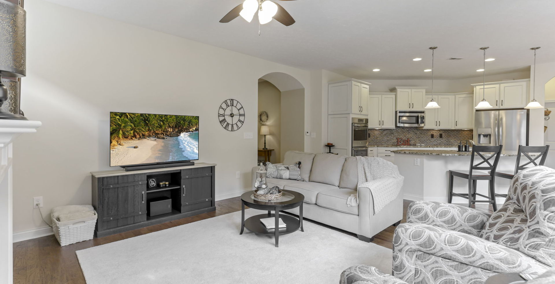 You will love the open floorplan with natural lighting. Spacious living room with shiplap accent wall, gas fireplace, ceiling fan, large windows, transom windows and custom blinds.